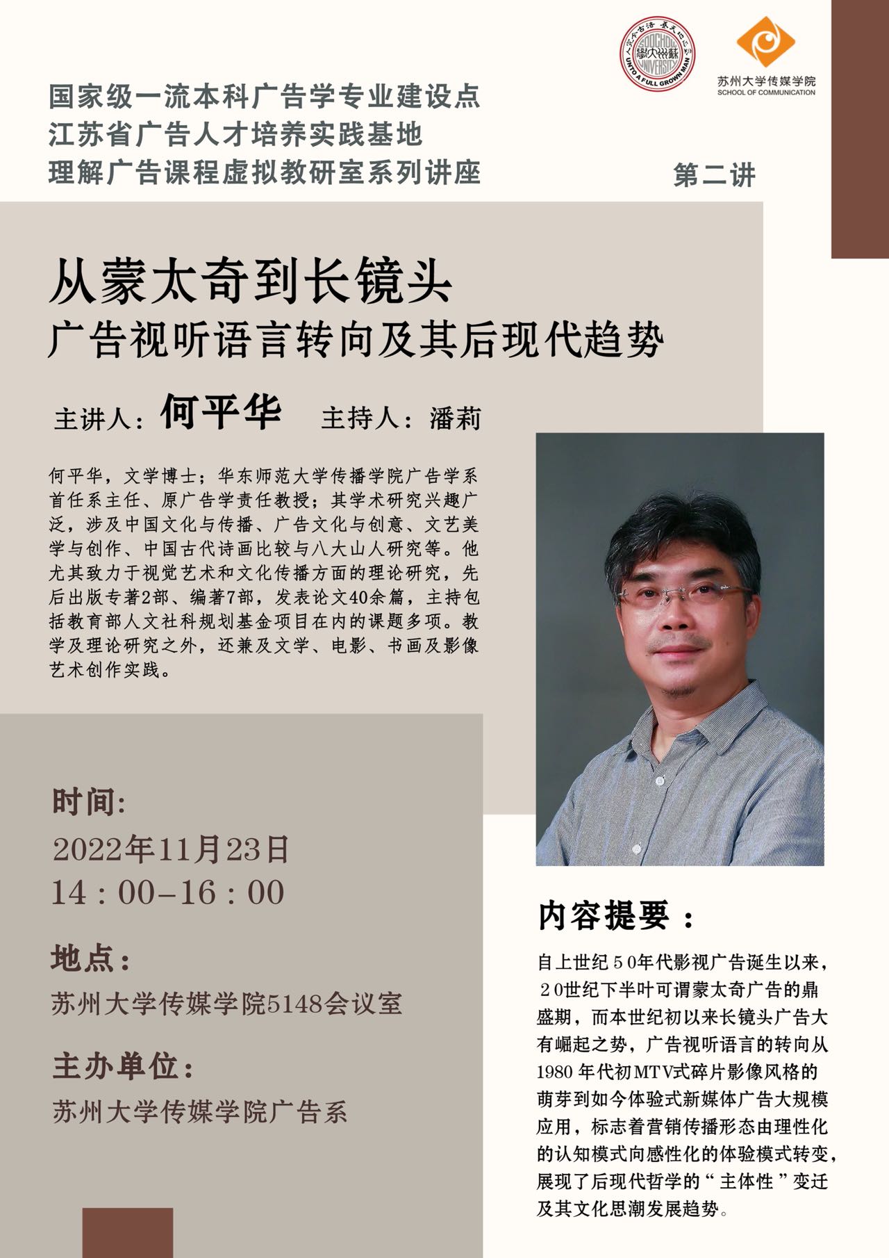 11月23日下午14:00,华东师范大学传播学院广告学系首任系主任何平华教授为我院广告系师生带来一场题为“从蒙太奇到长镜头——广告视听语言转向及其后现代趋势”的专题演讲。讲座采用线上线下结合的方式进行,由冠军体育下载潘莉老师主持。冠军体育下载广告系系主任胡明宇教授在讲座开场致辞。该讲座是国家级一流本科广告学专业建设点、江苏省广告人才培养实践基地、理解广告课程虚拟教研室系列讲座的第二讲。