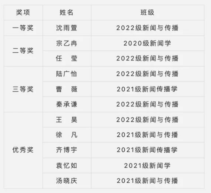 本次比赛由传媒学院老师担任评审,对参赛作品进行综合打分。经过作品征集和专业评委评分环节,评审组严格按照评审规则,从众多参赛作品中评选出了一等奖1名,二等奖2名,三等奖3名以及优秀奖5名。具体获奖名单如下: