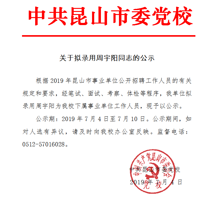 关于拟录用周宇阳同志的公示