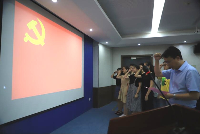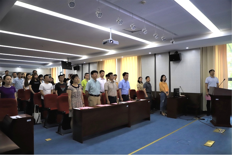 庄严肃穆的国歌拉开了本次大会的序幕,首先举行的是新党员入党宣誓仪式。学院党委委员、副院长谷鹏老师作为领誓人带领新党员宣读入党誓词。“我志愿加入中国共产党,拥护党的纲领……”新党员们面对党旗,举起右拳,庄严宣誓,铿锵有力的宣誓声传递出他们对党的忠贞与坚定信念。老党员们也借此机会重温入党誓词,又一次接受党的教育和洗礼,深刻感受到加入中国共产党是一生无悔的选择。