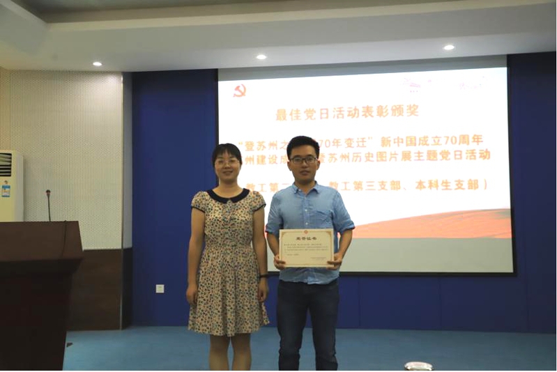 随后,大家一起观看了“最佳党日活动”的视频,由教工第三支部、教工第二支部和本科生支部带来的“登苏州之巅 看70年变迁”新中国成立70周年苏州建设成果暨苏州历史图片展主题党日活动展示。
