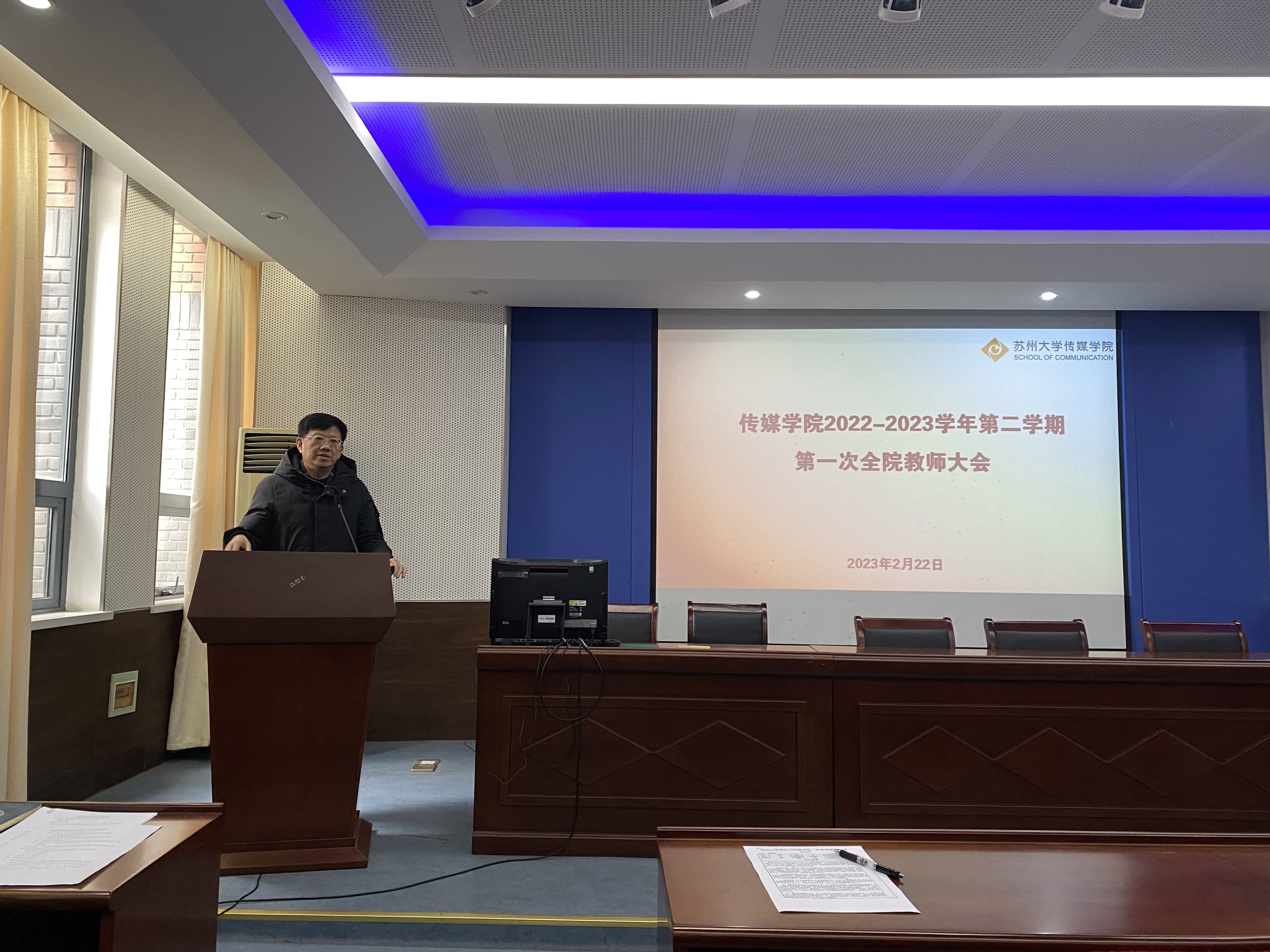 2月22日下午,传媒学院2022-2023学年第二学期第一次全院教师大会在学院5148会议室召开。学院全体教师出席本次会议。会议由学院党委书记宁正法主持。